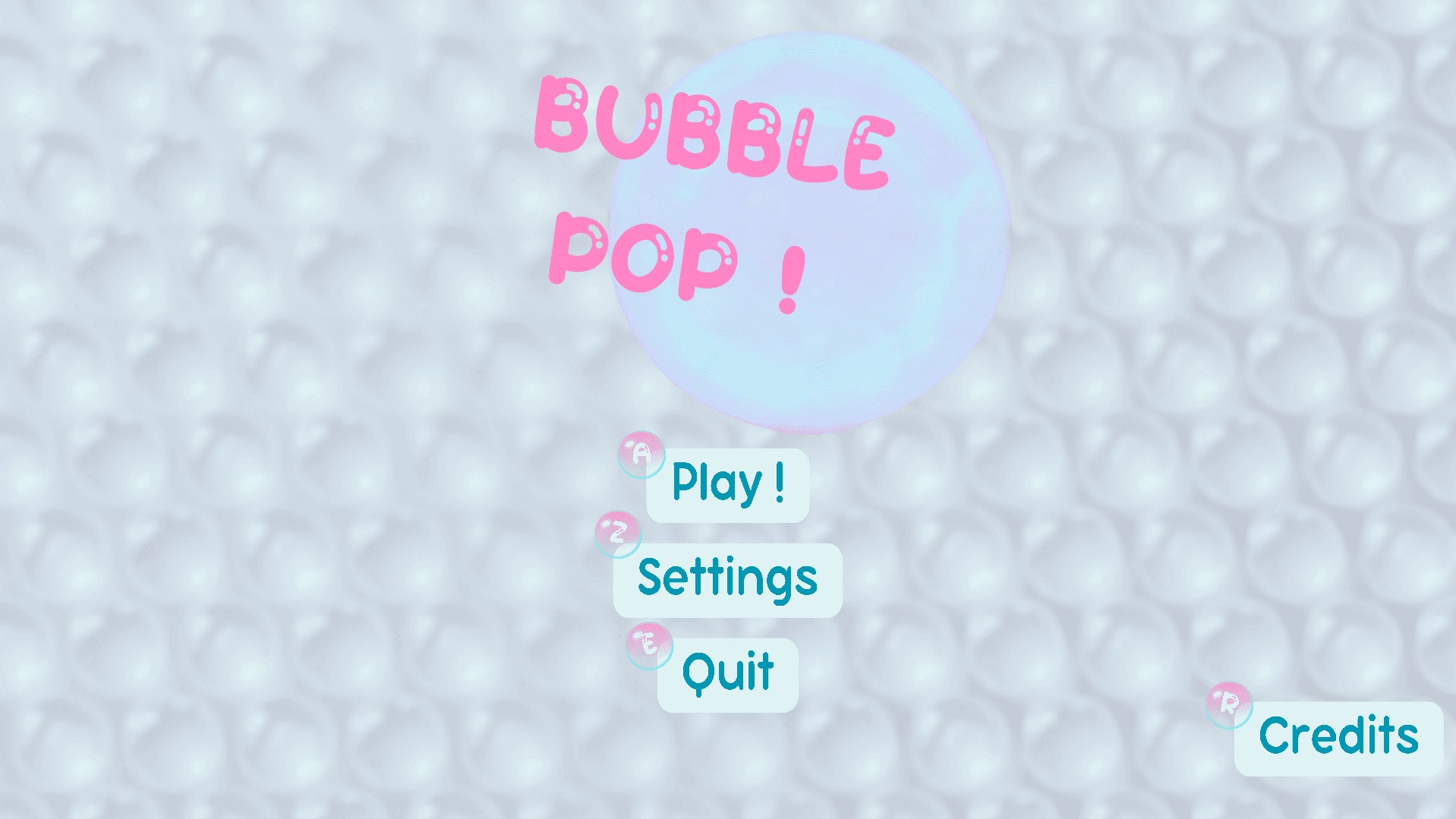 Pop bubbles using the first two letter rows of your keyboard. When a bubble displays a letter, press the corresponding key to pop it. In Infinite mode, fill your burst gauge and press Space to pop all bubbles at once. Press Esc to pause the game.